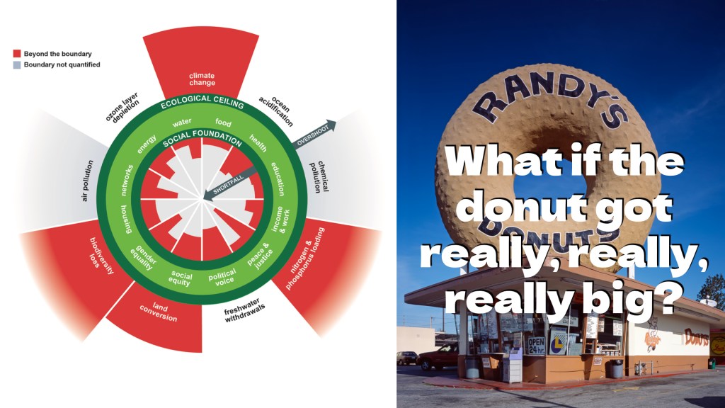 You have perhaps also heard of Kate Raworth’s notion of “Donut Economics”, looking to create systems that allow us exist in the ‘donut’ space between an equitable social foundation and an ecological ceiling.