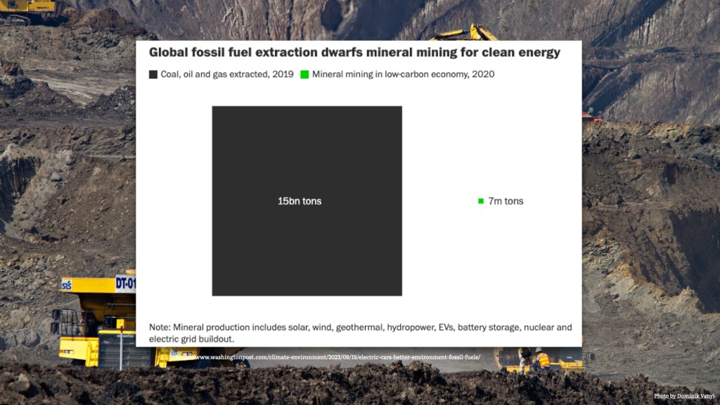 According to the WaPo: “In a scenario limiting global warming to 2 degrees Celsius, the IEA estimates the amount of critical minerals needed would be roughly 500 times less in terms of volume than today’s fossil fuel extraction.”