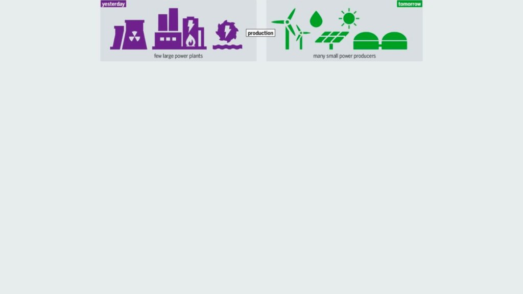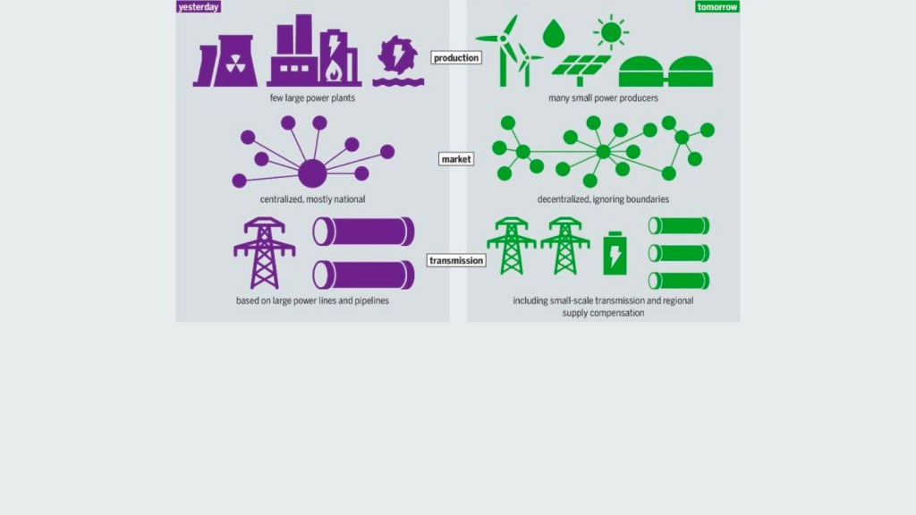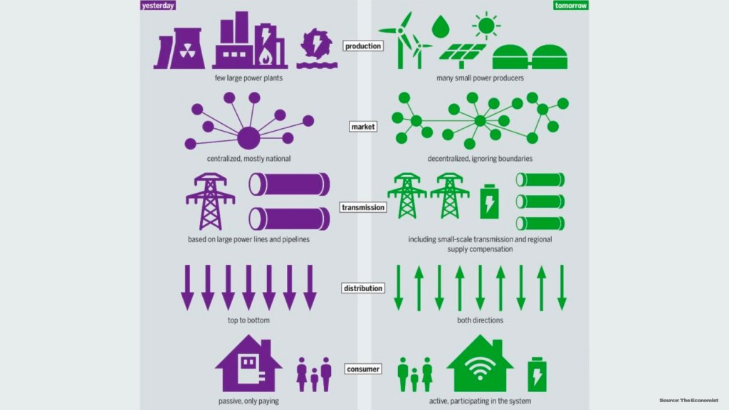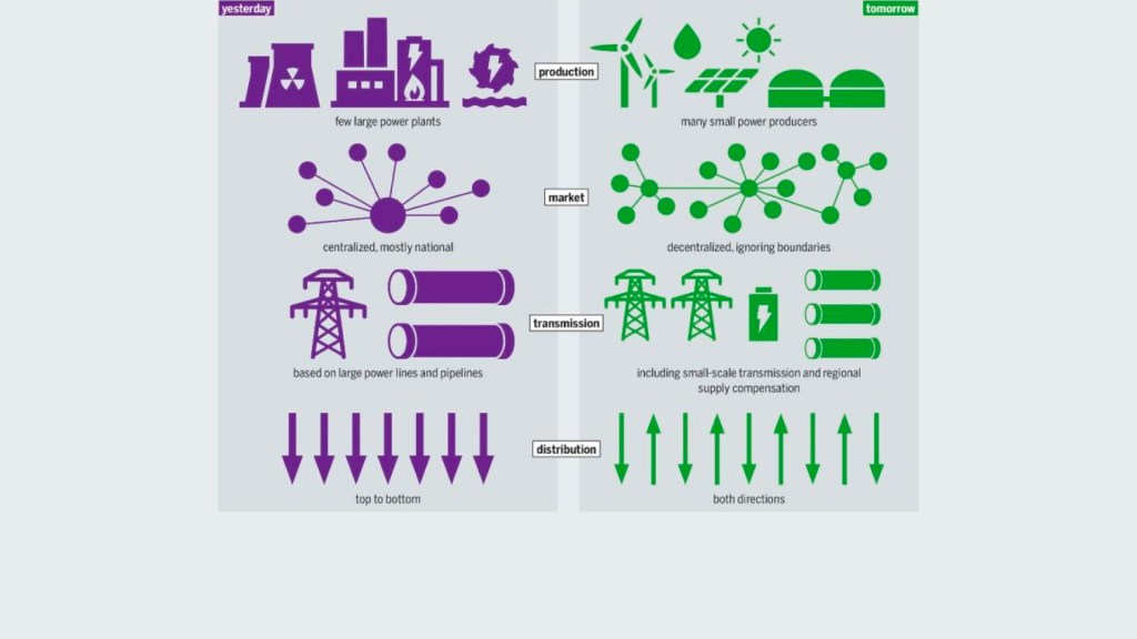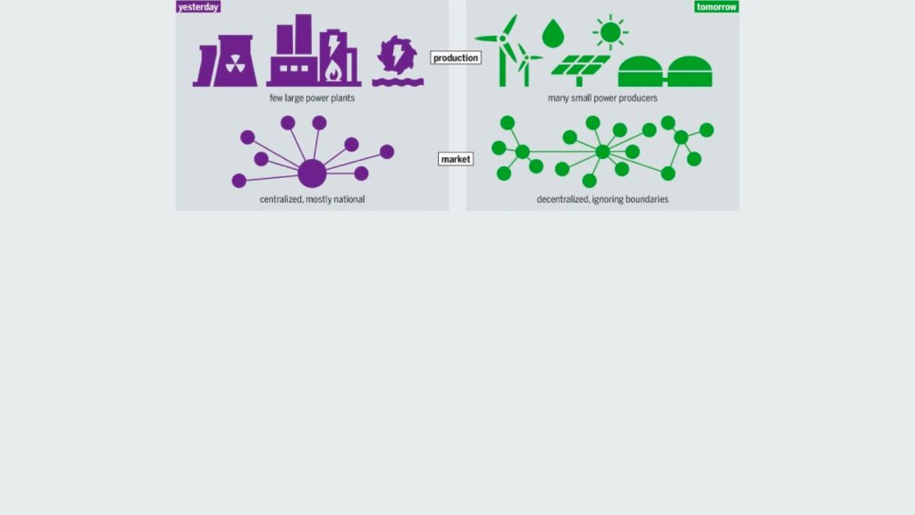 It shows the juxtaposition of the top-down, fossil fuel driven model of having few large producers of energy to a future of many, smaller producers…