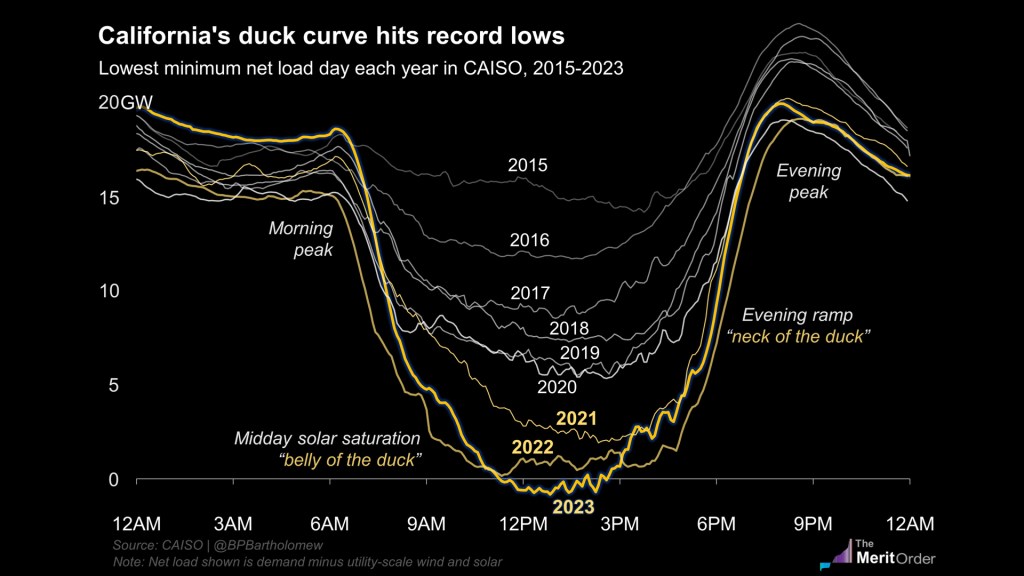 This is what gets called the ‘duck curve’ – the reason the belly of the duck gets lower year on year is the amount of solar production that is being added, creating tons of energy in the middle of the day.