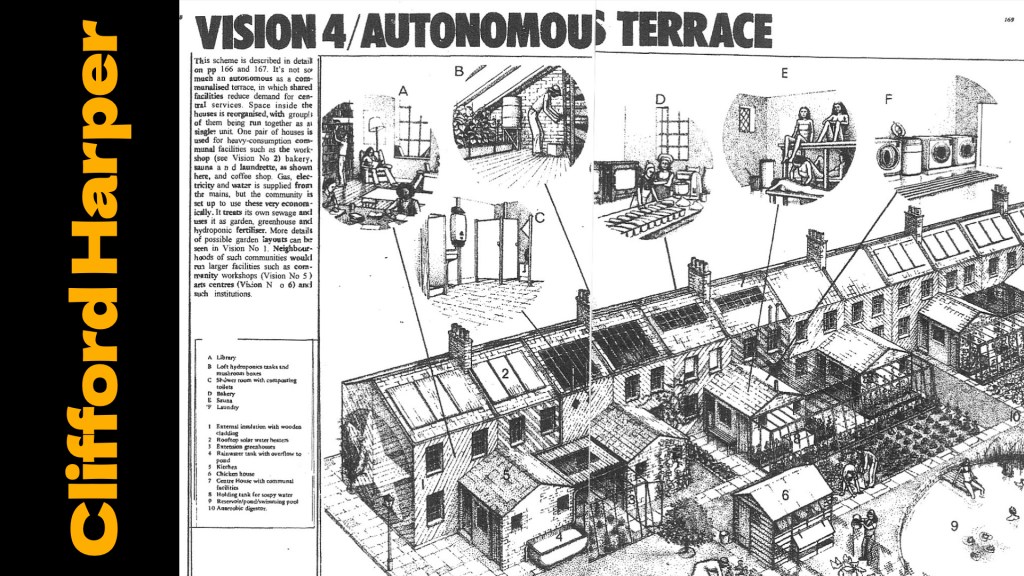 Finally – Here’s Clifford Harper’s illustrations of ‘the autonomous terrace’ from his 1974 book “Radical Technology” – workshops, saunas, greenhouses, solar.