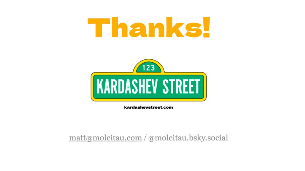 The talk starts with a clip of the Sesame Street theme, that I’ve mangled into… Kardashev Street. This amuses me greatly, but of course anyone under 30 or not from the UK/USA stares blankly at me while this plays.